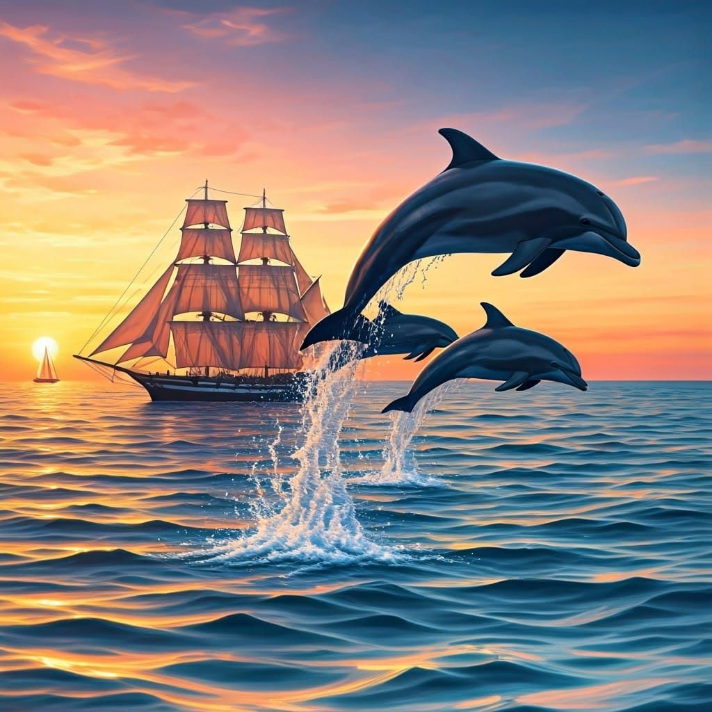 A vibrant image of dolphins leaping from the ocean at sunset. The idyllic scene features a silhouetted sailboat set against vivid colors in an impressionistic style.