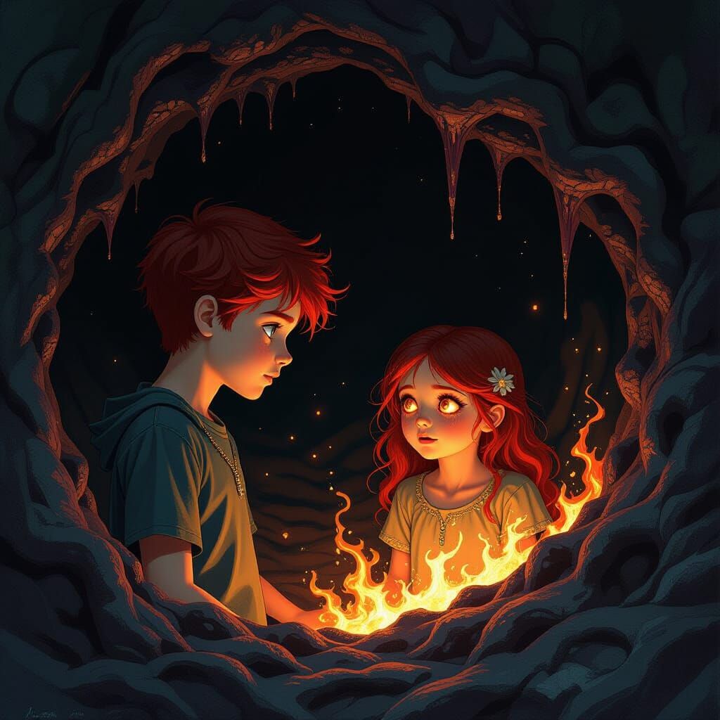 A digital painting depicts young Kairos and Hestia meeting within Cronus's stomach. Visceral textures and organic forms create an unsettling atmosphere with eerie, glowing light.