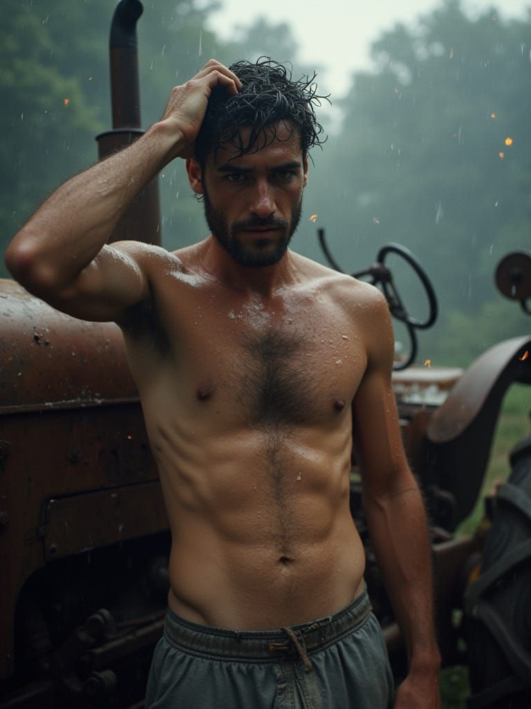 This image shows a close-up of a young, sweaty worker in the rain, highlighting his physique. He stands near a vintage tractor with a forest backdrop, illuminated by distant lights and fireflies in a soft, pastel aesthetic.