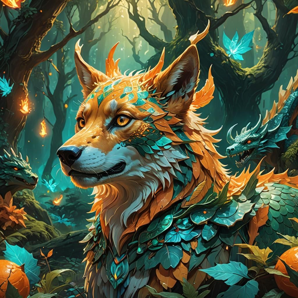 A striking picture of a mythical dragon with doge heads in a vibrant forest. The creature's iridescent scales reflect turquoise, emerald green, fiery orange, and yellow hues, illuminated by ethereal light.