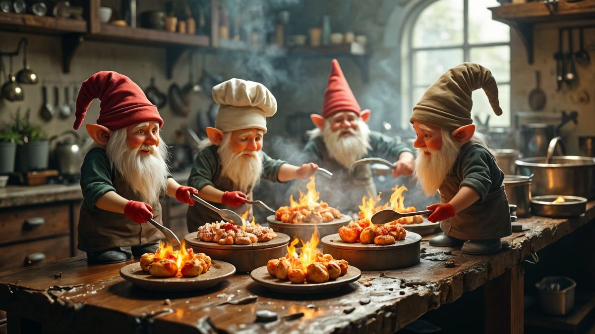 This image depicts a bustling commercial kitchen staffed by gnomes, who are preparing magical mushrooms and unicorn meat. The fantastical scene is rendered in vibrant colors.
