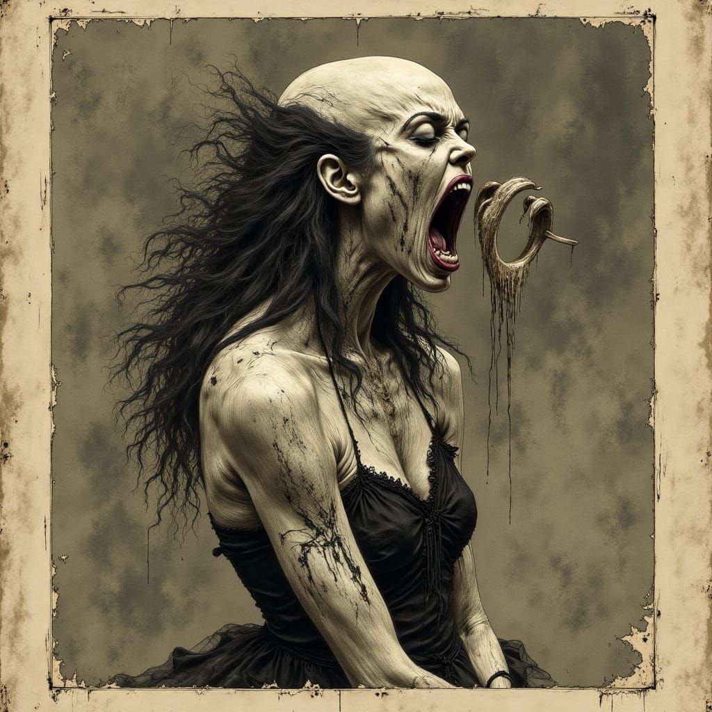 This image shows a screaming female banshee in a fantasy setting. The artwork evokes a traditional illustrative style with elements of Nordic folklore.