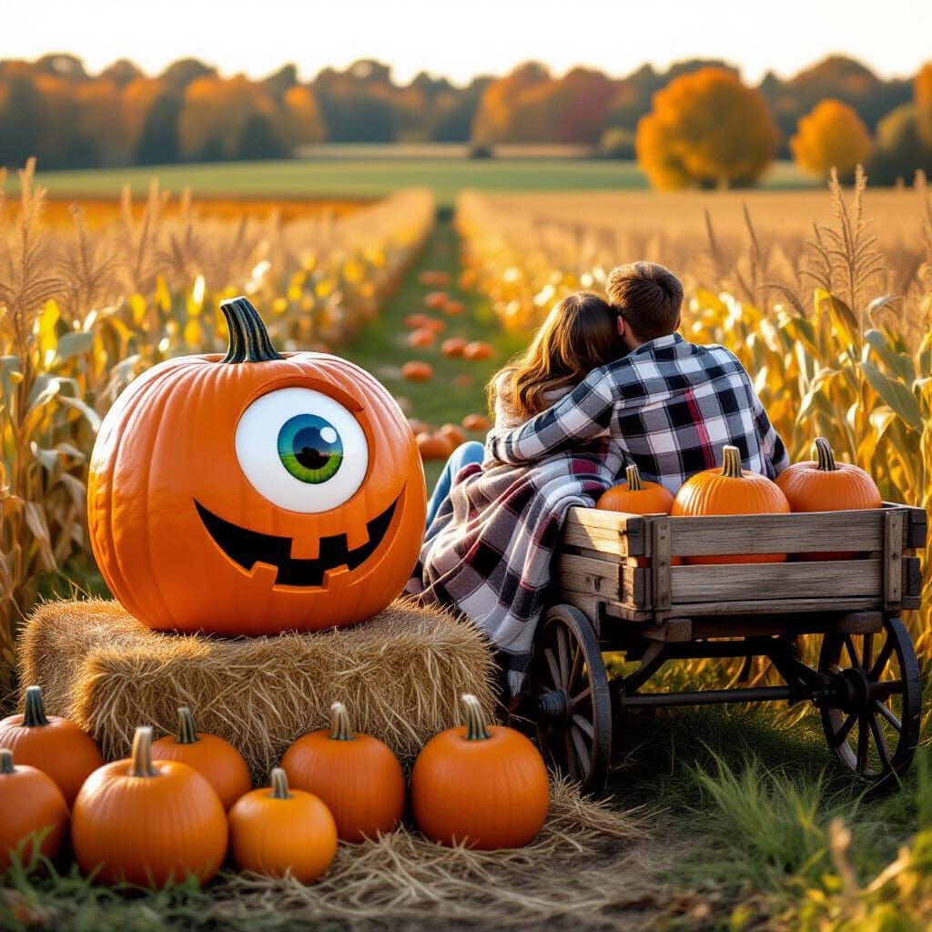 an eyeball pumpkin watching a couple cuddling in one cozy blanket sitting on haystack on the bed of old wagon filled with pumpkins hitched on a tracker pulling them through trail of pumpkin patch and corn stalks field, washes away in an autumn warm colours
