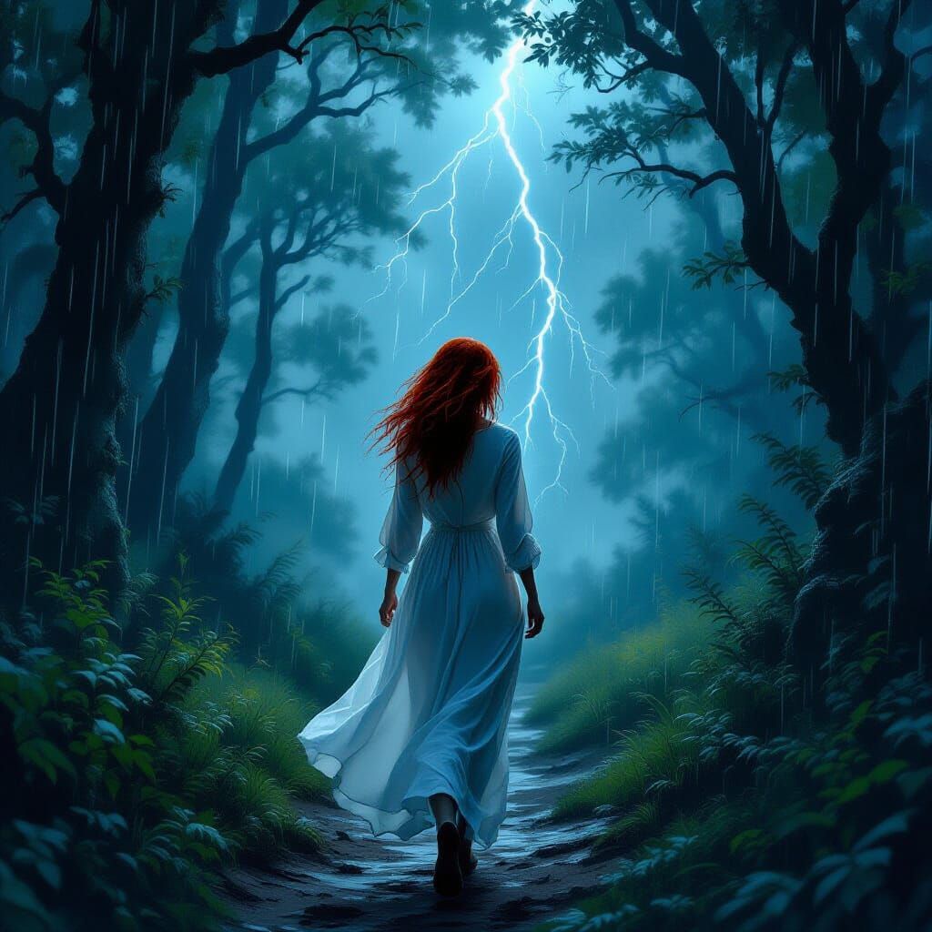 A striking image of a woman with vibrant red hair and dark eyes walking through a rain-soaked ancient forest. Rendered in a dramatic, painterly style with vivid cool colors and dramatic lighting.