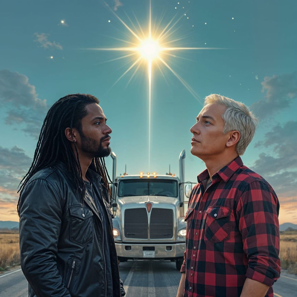 This image shows two truck drivers, one with dark skin and one with light skin, standing next to a Kenworth T680, staring in amazement at a bright light in the sky as tears stream down their faces.