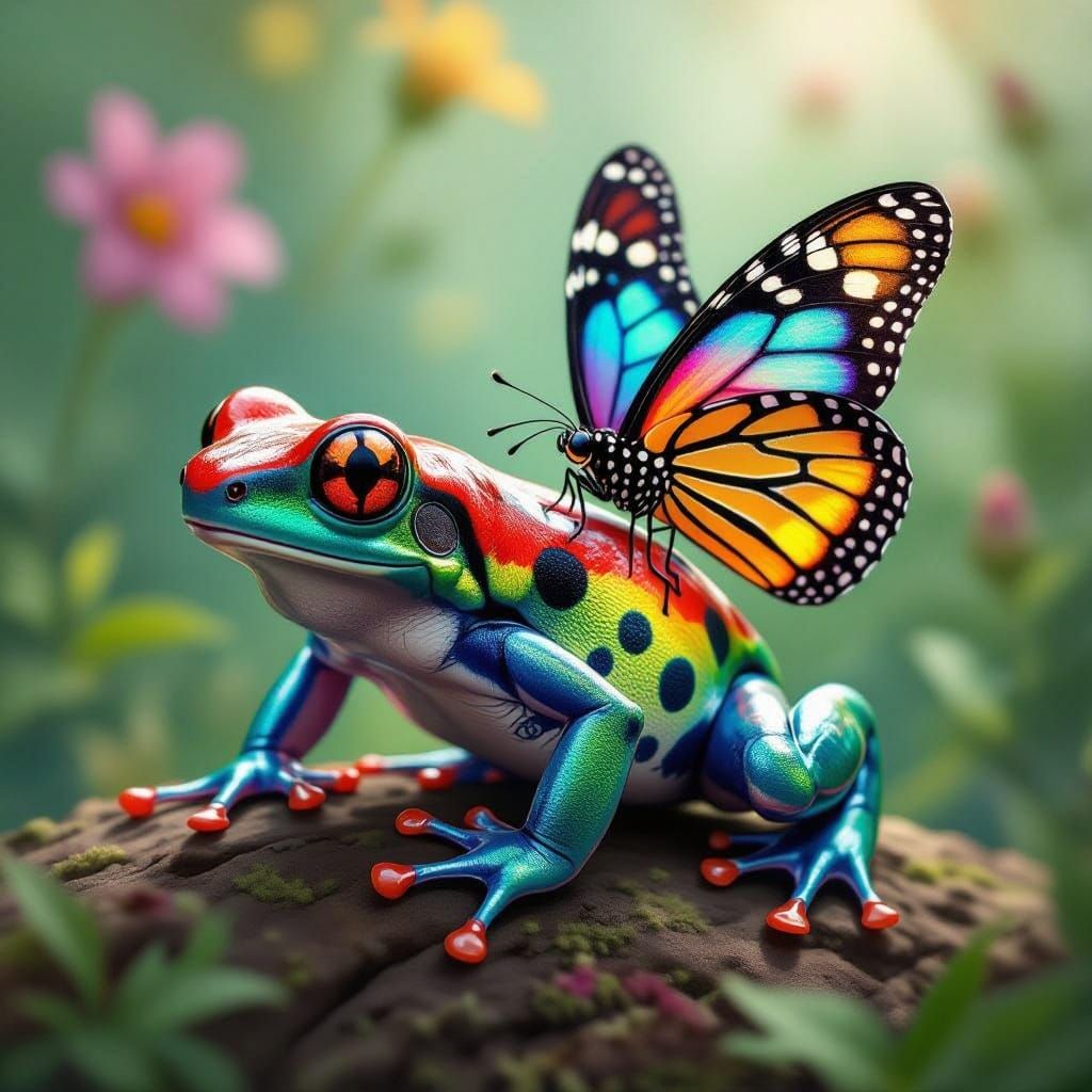 This image shows a vibrant strawberry poison dart frog with iridescent blue jaguar legs and rainbow butterfly wings. The artwork blends realistic wildlife illustration with fantastical and dreamlike elements.