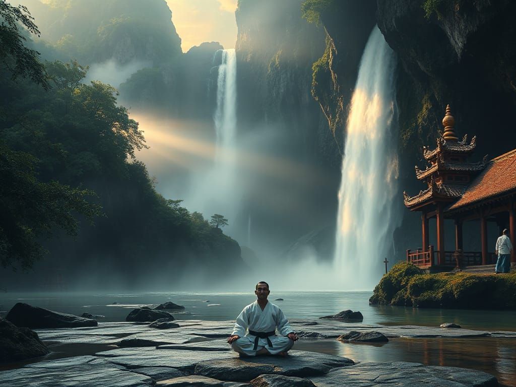 This image shows a karate master meditating by a waterfall at dawn. The matte painting style features deep colors and intricate details, similar to fantasy concept art.