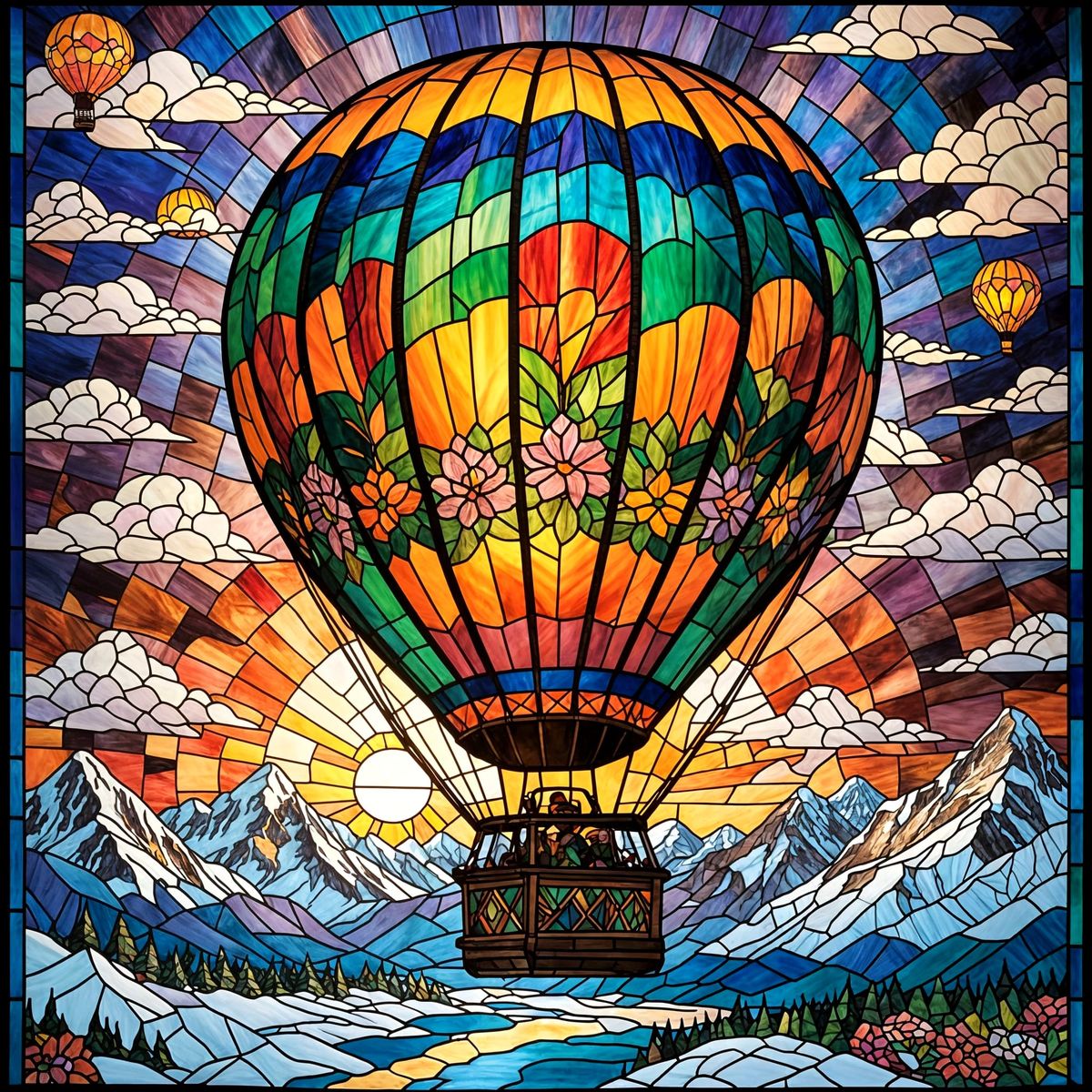 A vivid image of a stained-glass hot air balloon soaring above snow-capped Mt. Everest. The balloon, illuminated from within, features a floral pattern and a rainbow of colors.