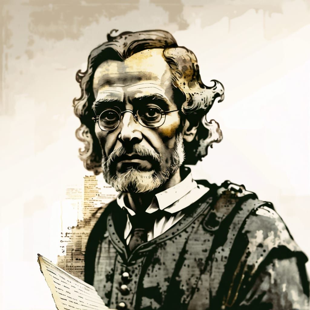 This image shows a man holding old books and papers in warm, golden light. The mixed media art style features ink stains, faded typewriter font, earthy tones, and high contrast textures.