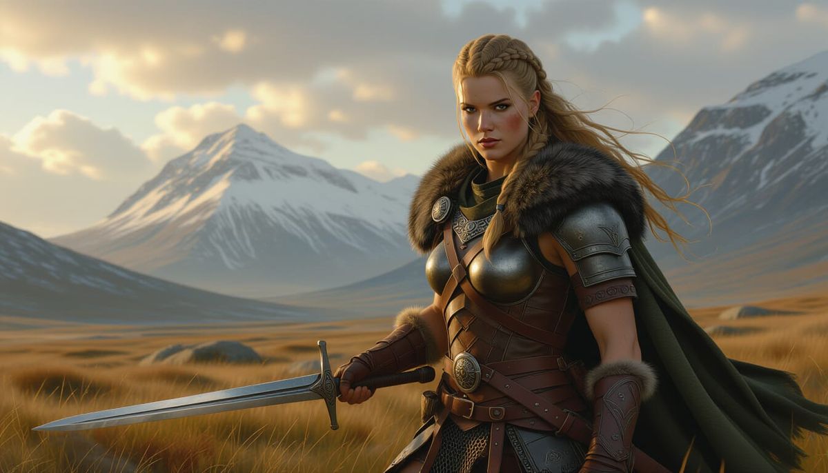 A striking picture of a Viking warrior woman in leather armor, holding a sword in a Scandinavian landscape. The image has dramatic lighting and intricate textures, as hyperrealistic digital art.