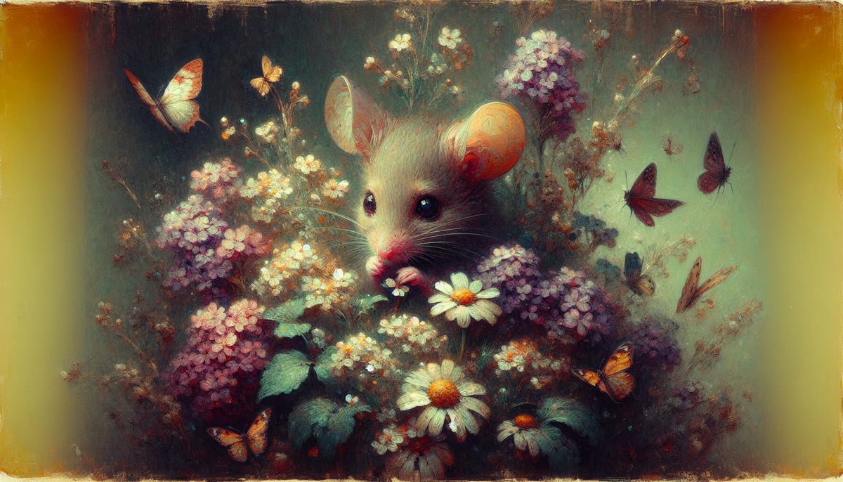 A sorrowful yet hopeful image of a shy mouse hiding behind wildflowers. The scene is rendered with smooth oil and ink in an ethereal color palette, using open impressionism and impasto brushstrokes.