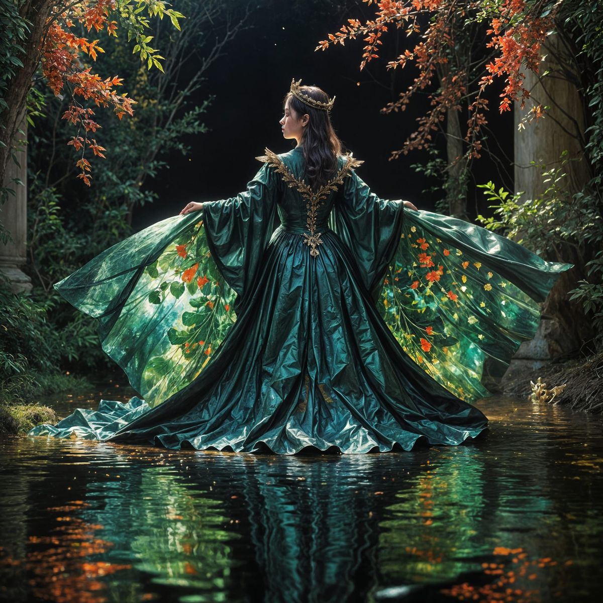 This image depicts a majestic female figure in a flowing cloak with wings, set against a stunning backdrop of an angelic castle, with dramatic light and hyperrealistic textures, as if rendered in a surreal masterpiece of cosmic proportions.