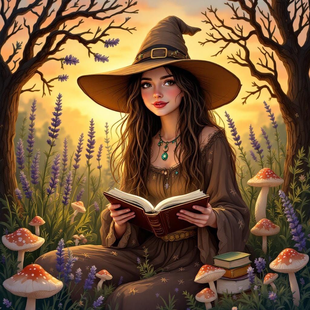 This image shows a cottagecore witch in her garden at sunset. Lavender, mushrooms, and spell books surround her, creating a whimsical storybook illustration.