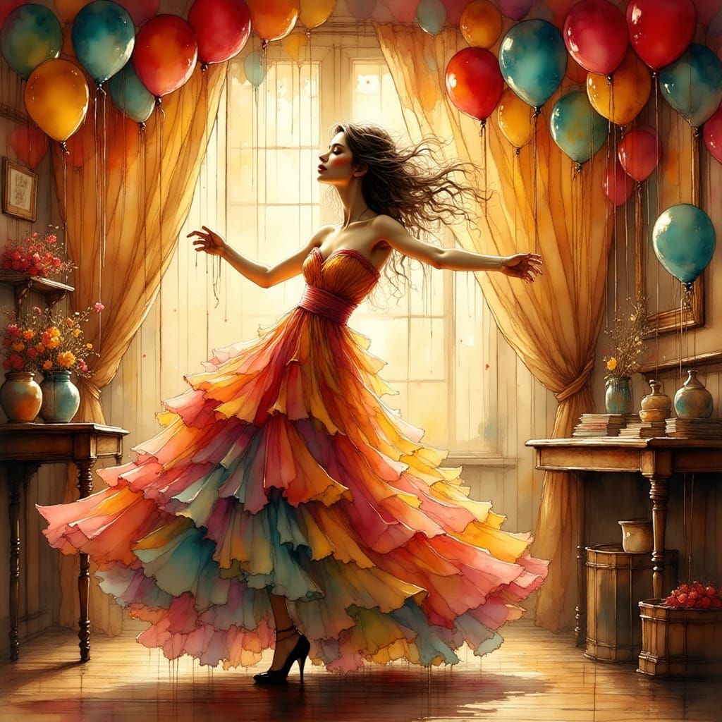 A festive image of a woman dancing in a gown amidst balloons and streamers. The scene is reminiscent of art nouveau, with a whimsical and dreamy aesthetic.