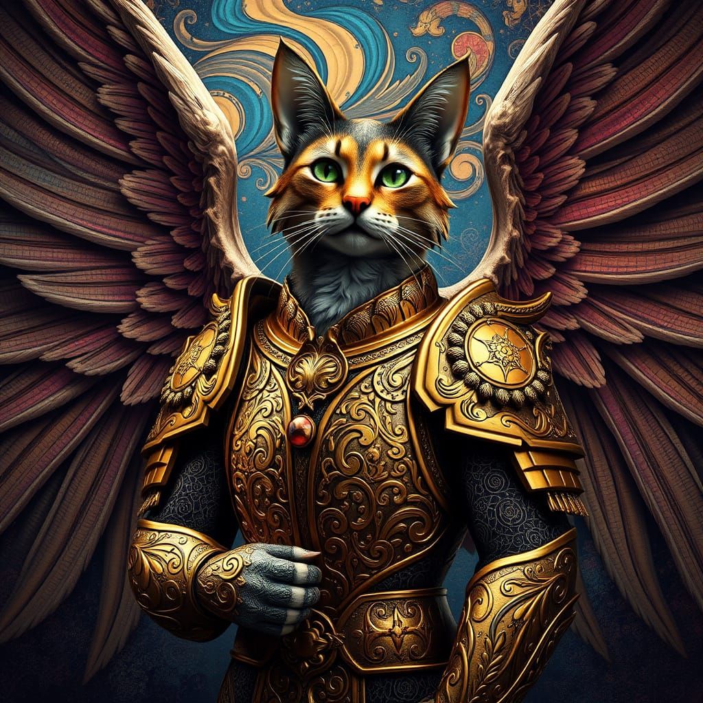 A vivid image of a winged cat Arcangelo Michele in golden armor, enveloped by swirling patterns. The artwork features a blend of luxurious ornamentation and dreamlike surrealism.
