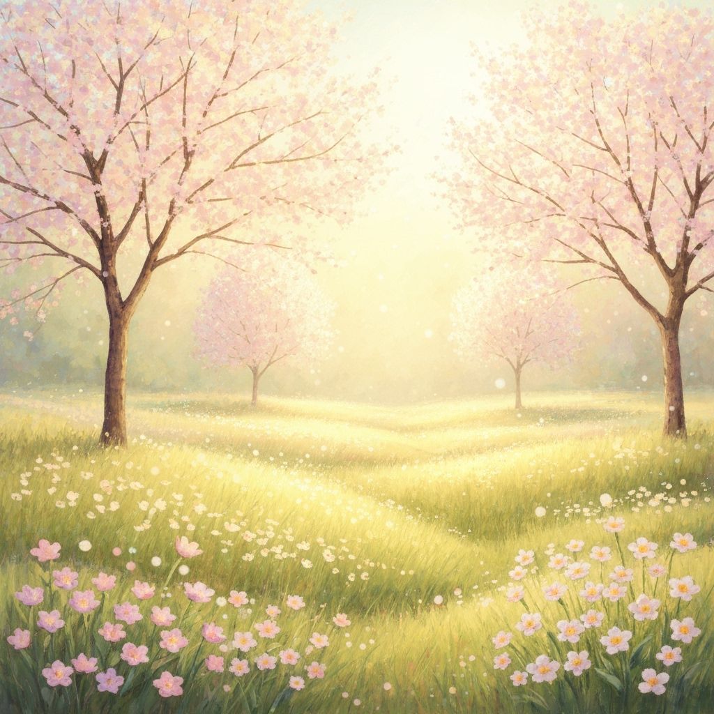 This image shows a peaceful European meadow filled with pastel flowers and blossoming trees, rendered in an impressionistic watercolor style with soft textures and gentle, warm lighting.