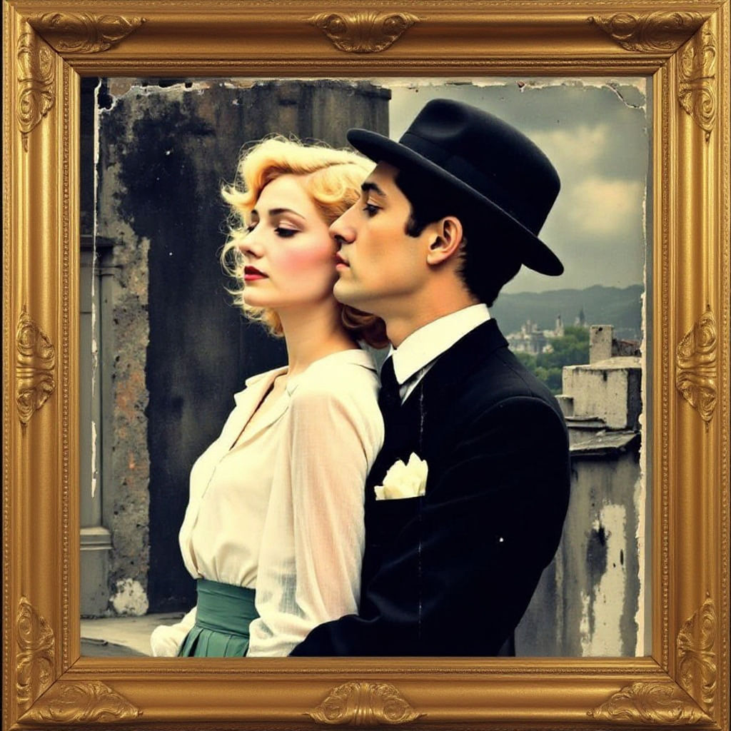A striking picture of a languid fashion illustration with saturated colors and fluid lines. The image evokes a vintage love story in a vibrant, expressive style.