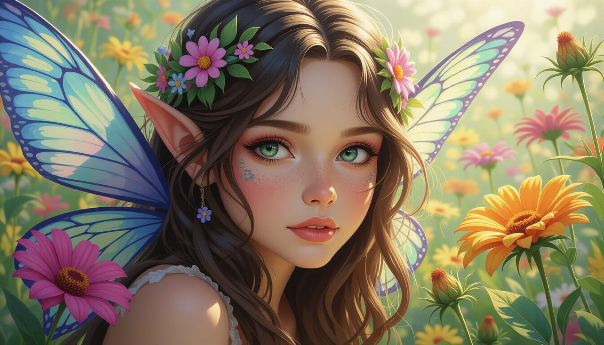 A shy fairy peeks from a vibrant flower garden in this hyperrealistic, detailed digital painting. The artwork features dramatic lighting and a colorful, atmospheric background.