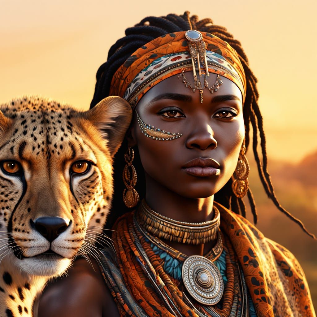 A vibrant portrait depicts an African woman with tribal paint beside a cheetah during a savanna sunset. The artwork features dynamic lighting and intricate details, rendered as splash art.