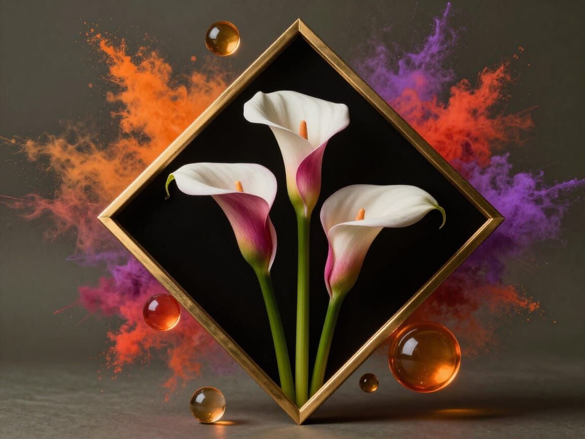 This image shows pristine Calla lilies within a polished brass geometric frame against a black backdrop. Explosive clouds of colored powder and amber spheres add dramatic flair, rendered in hyperrealistic style with cinematic lighting.