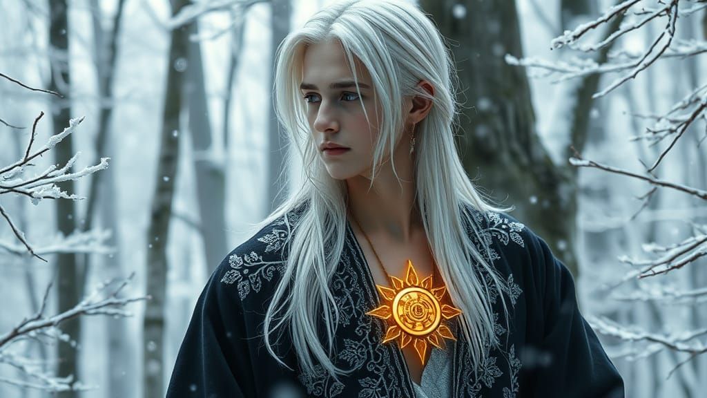 This serene image depicts a young man with flowing white hair and pale skin, adorned in a black robe with silver embroidery, standing amidst a mystical snowy forest, evoking a dreamy, ethereal quality reminiscent of Japanese paper drawing masters.