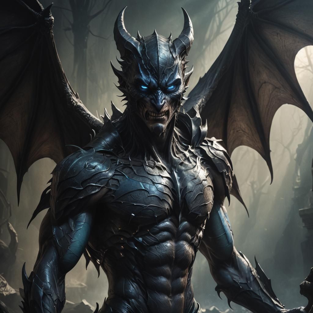 A striking picture of a male humanoid with bat wings and a serpentine tail. The creature, rendered in a dark fantasy style, features dramatic lighting, intense colors, and sharp textures to enhance its eerie presence.