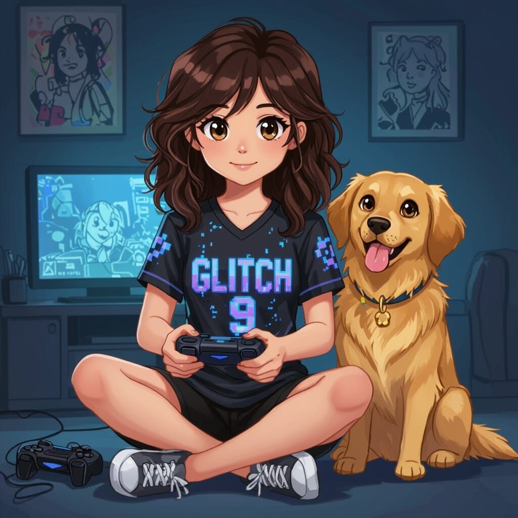 This anime-style image features a young girl with wavy brown hair and brown eyes, engaged in gaming and drawing. She's accompanied by her golden retriever pet, wearing a glitchy jersey.