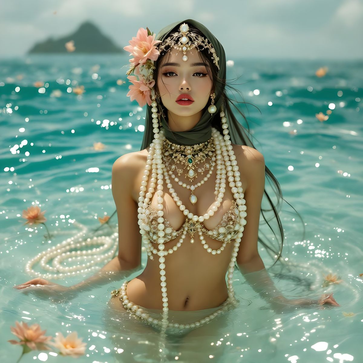 This image portrays an Asian woman in a hijab and pearl jewelry. The artwork blends art nouveau elements with a dreamy aesthetic, reminiscent of elegant, intricate designs.