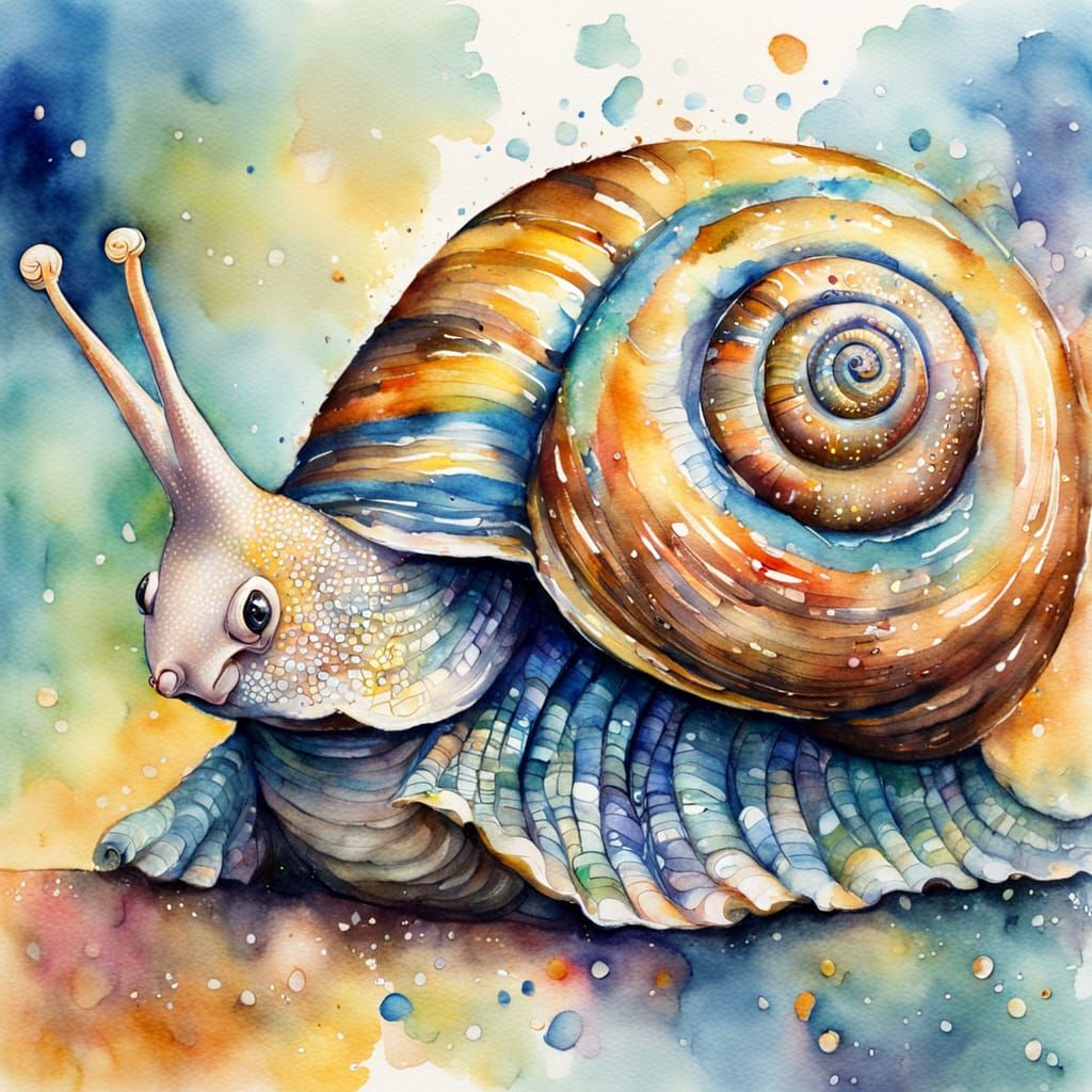 A close-up watercolor illustration of a snail with large blue eyes watching television. The artwork features soft, blended colors and warm, golden lighting, creating a whimsical and playful scene.