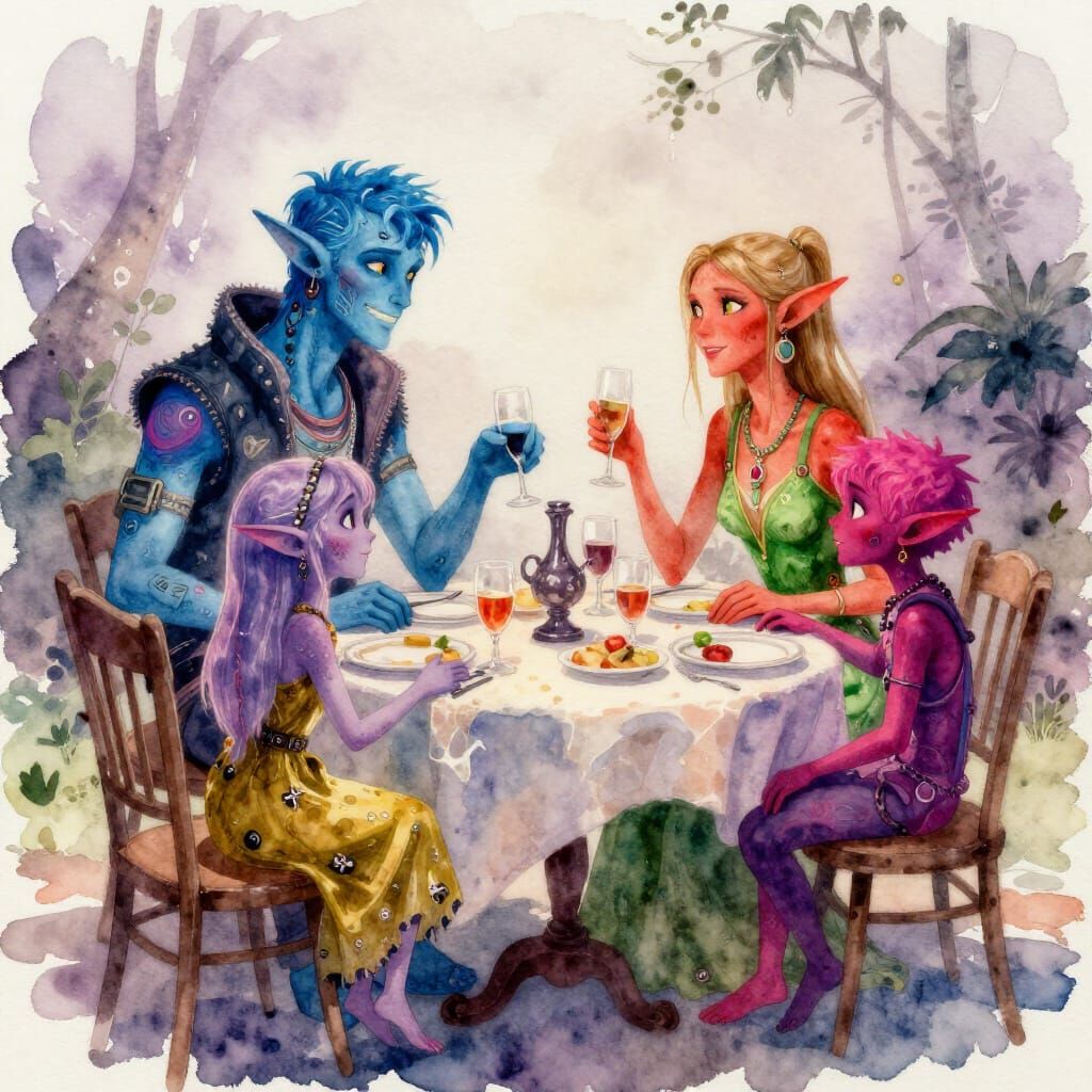 This image depicts a whimsical watercolor scene of a tidal punk elf family enjoying a meal together. The family members display vibrant skin tones and unique attire.