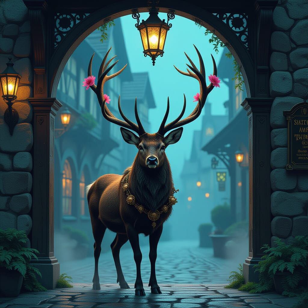 A majestic stag with flower and gear-adorned antlers stands at a foggy tavern entrance. The scene features bioluminescent moss and cobblestones, rendered with Art Nouveau and steampunk influences.