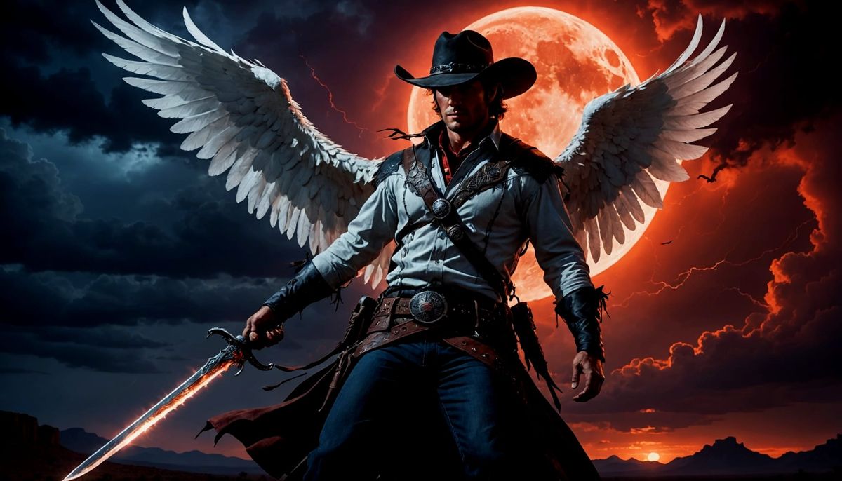 A cinematic dark fantasy image shows a cowboy with glowing eyes riding a demon horse under a stormy red moon. Celestial fire sword and angelic wings complete the epic scene.