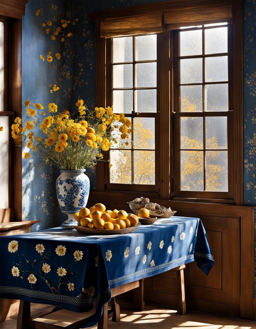% && Old butcher Table by a large bright window bundles of arranged Dry flowers golden and delft blue in a dimpled copper bucket whitewashed walls contre-jour god rays radiant rays Jackson Pollock Vermeer striking hyper real painting atmospherics