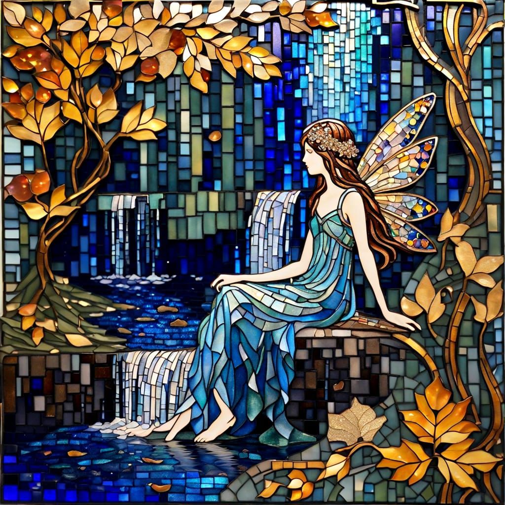 This image presents a close-up of an ethereal fairy crafted in Art Nouveau mosaic stained glass style. It features a detailed mosaic with blues, gold, and silver accents, reminiscent of Klimt's work.