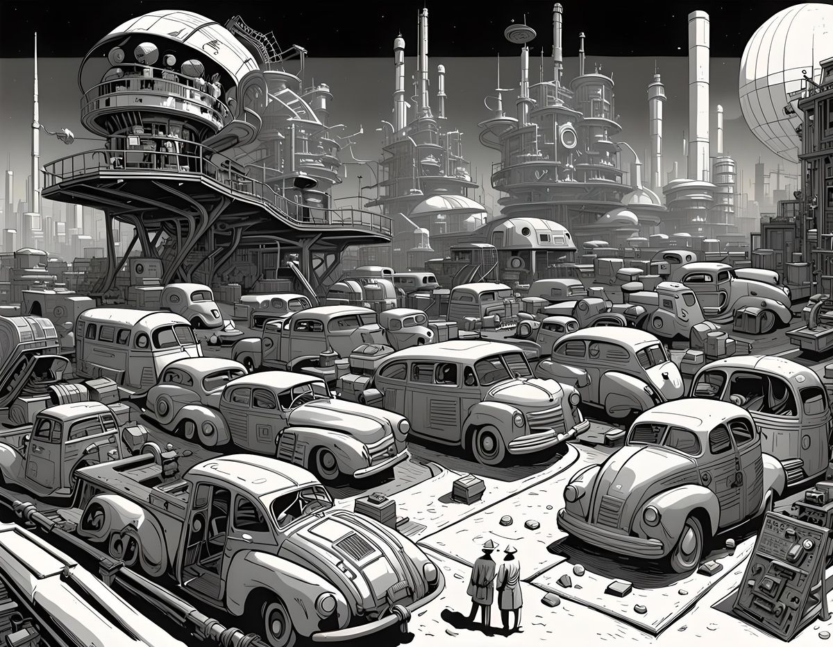 This image shows a science fiction junkyard filled with parts and strange machines. The scene is depicted with high-contrast lines, exaggerated features, and dramatic lighting, as a humorous illustration.