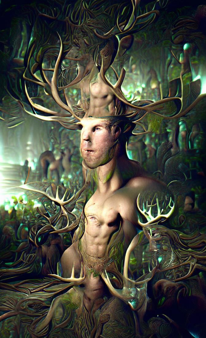 attractive healthy male figure with antlers growing out of his head; huge rack of antlers; enormous antlers; humanist proportions, perfect proportions, golden ratio face, appealing; symmetrical features; align face vertically