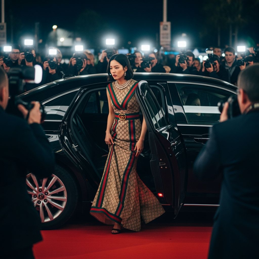 A captivating photo shows a Korean woman in a Gucci gown exiting a black car in Cannes. The paparazzi-style shot captures the elegance and chaos with deep colors and intricate details, with a matte painting aesthetic.