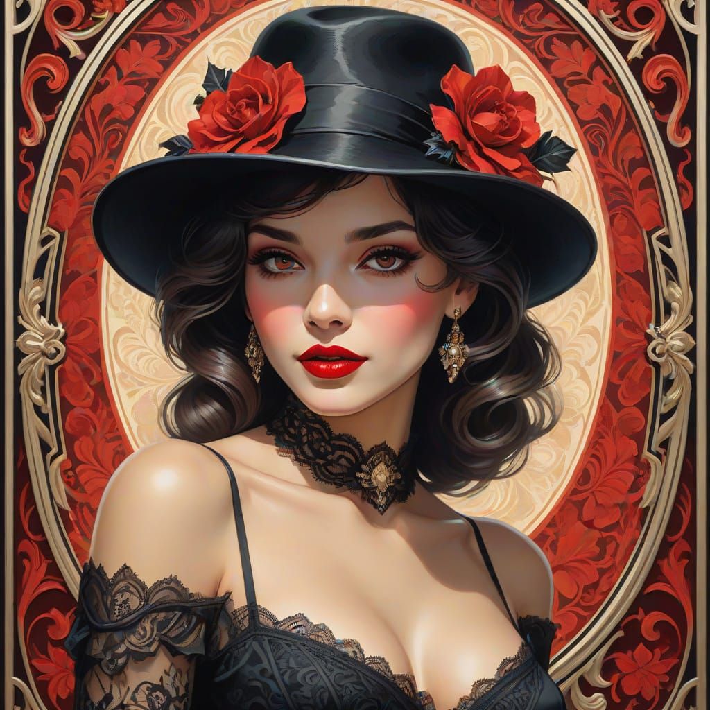 This Art Nouveau digital painting features an alluring woman with a fedora and lace camisole. Dramatic lighting highlights her dark eyes and red lips against a rich damask pattern.