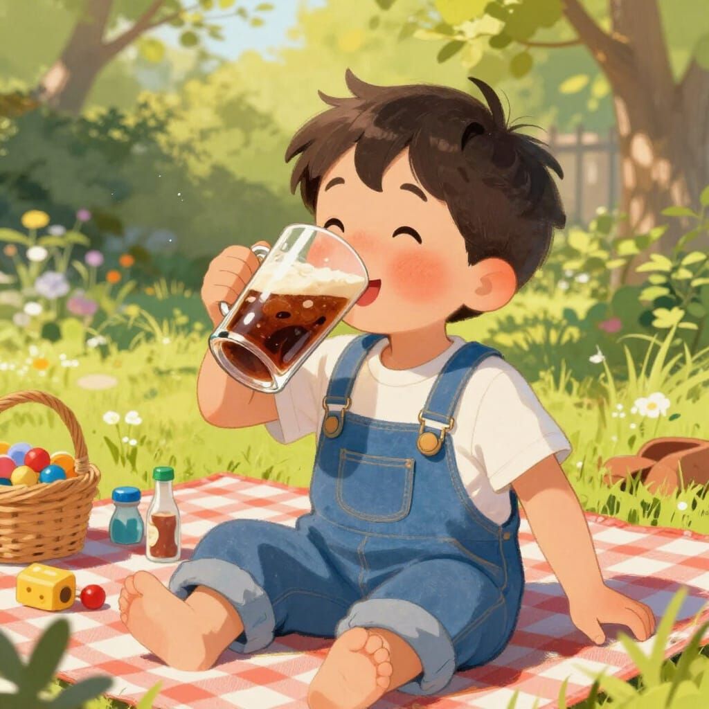 A whimsical illustration of a happy boy in overalls enjoying a frothy root beer in a sunlit backyard. The art style features dynamic brushstrokes and a warm, saturated color palette, capturing a playful atmosphere.