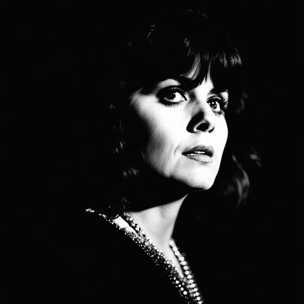A striking black and white film noir portrait of a singer. The high contrast photography and shallow depth of field create a moody, dramatic atmosphere with dark shadows and intense focus.