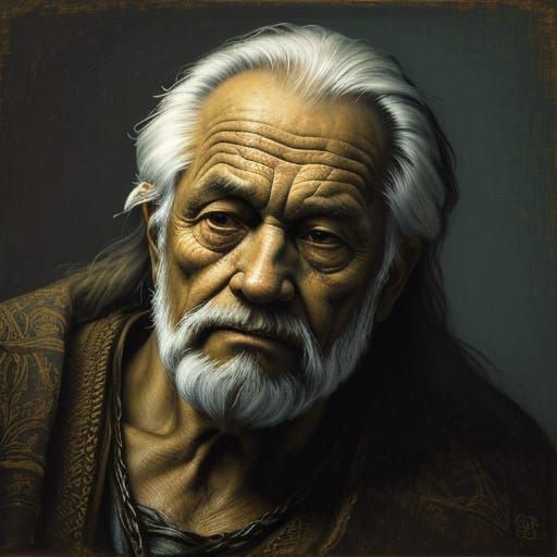 This oil painting captures an old man in a dimly lit room, featuring a Rembrandt lighting style with deep shadows and highlights. Evokes a quiet, introspective mood with rich, earthy tones and painterly texture.