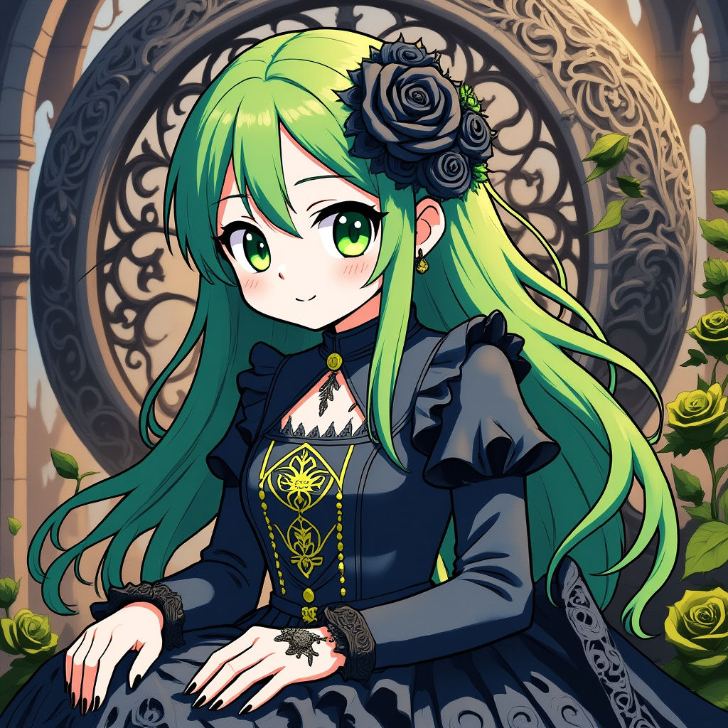 This digital painting features a stylized gothic character with pale skin, large chartreuse eyes, and vibrant acid-green hair adorned with black roses. She wears a lace dress and platform boots, seated on a stone sphere.
