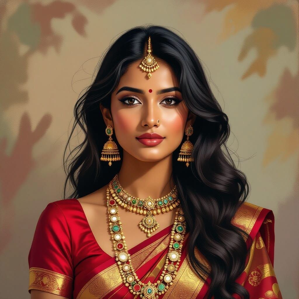 A stunning portrait of an Indian woman, dressed in traditional attire, adorned with intricate jewelry and set against a vibrant, textured background, blending realism and expressive brushstrokes.