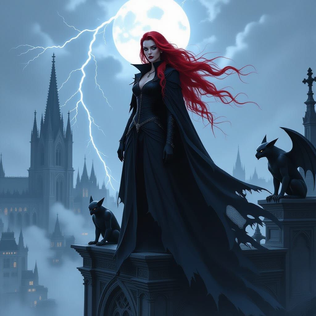 This image shows a powerful sorceress with flowing red hair standing on a cathedral. The dark fantasy scene features dramatic lighting, gothic horror elements, and cinematic inspiration.