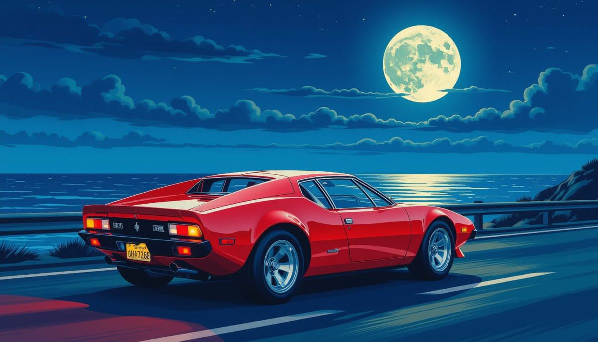 This image shows a classic red 1973 De Tomaso Pantera L speeding along a UK coastal highway at night. The artwork, in a retro comic style, features high contrast and cool tones, with a full moon reflecting on the car and ocean.
