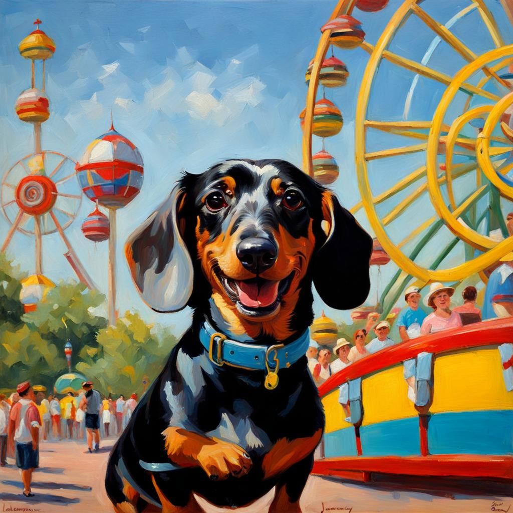 This image shows a happy dachshund at an amusement park, rendered in an oil painting style. The artwork captures the cheerful expression of the dog.