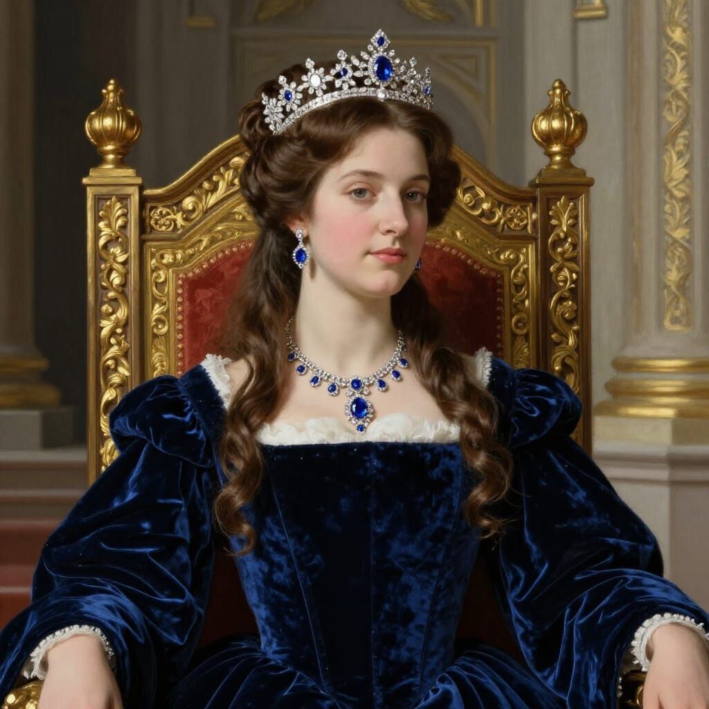 A striking image of a regal lady in a navy velvet gown, wearing a white gold diamond crown and sapphire necklace. Rendered in the rich, detailed style of Pre-Raphaelite art with dramatic lighting.