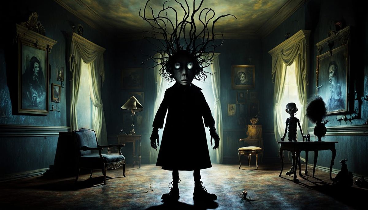 This haunting image captures a dark figure standing in a dimly lit room, blending the eerie atmospheres of Dali and Tim Burton. Detailed and moody, it embodies the stuff of childhood nightmares.
