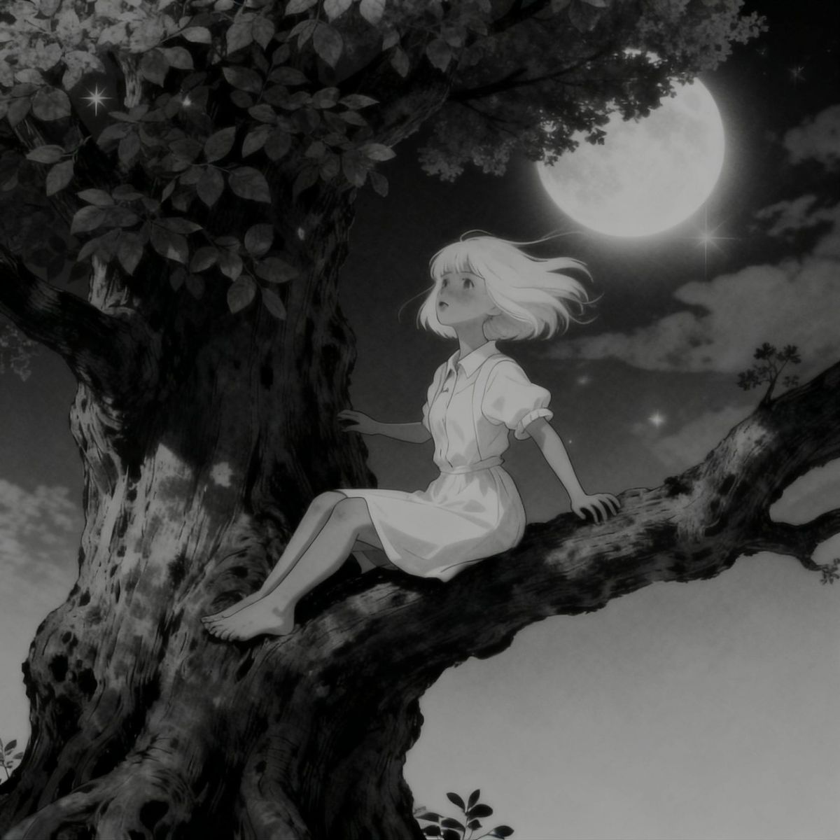 A striking black and white image featuring a luminous moon and an oversized crown against a night sky. The composition emphasizes contrast and light.