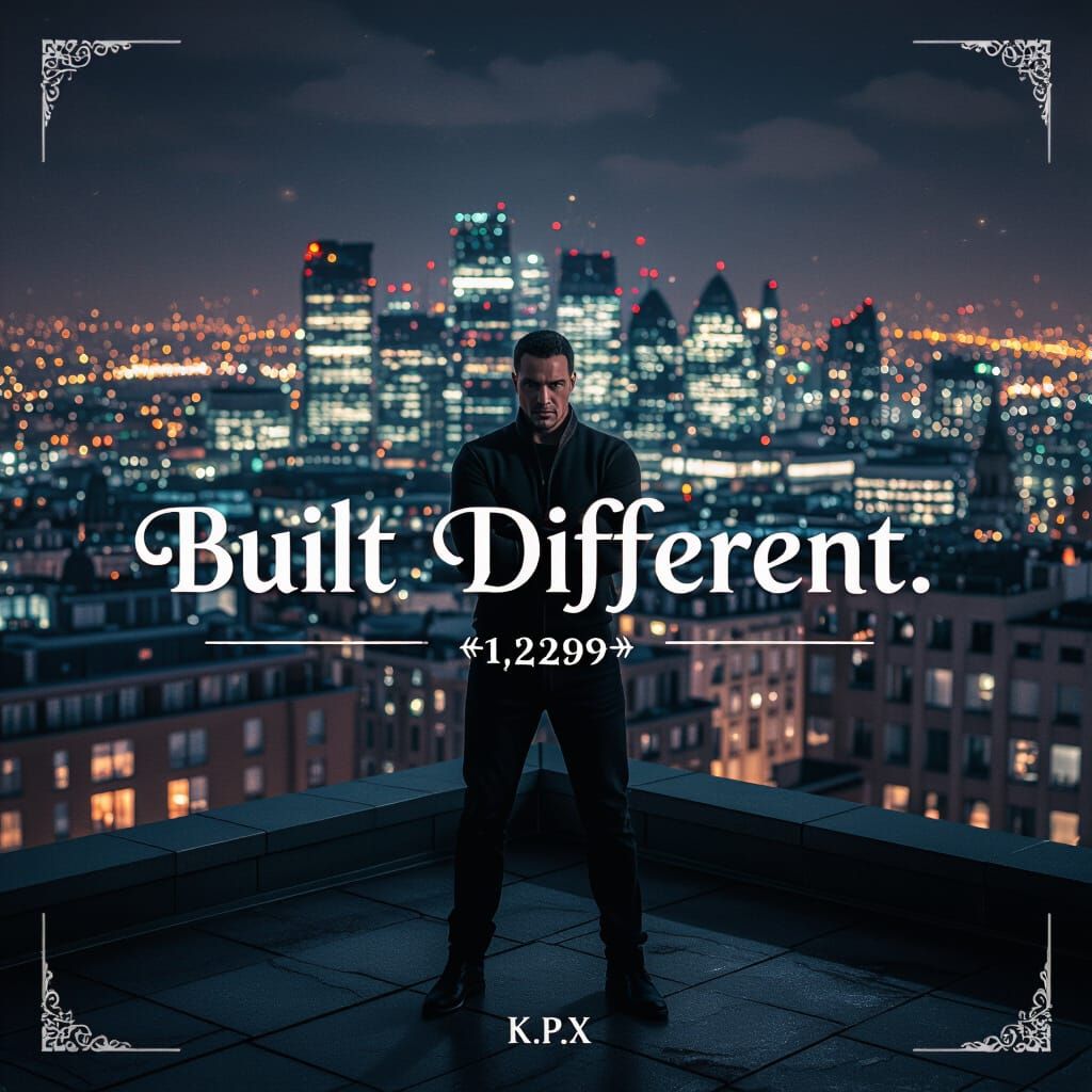 This hyperrealistic image shows a lone figure on a London rooftop at night, radiating confidence amidst glowing city lights. Dramatic lighting enhances the epic atmosphere.